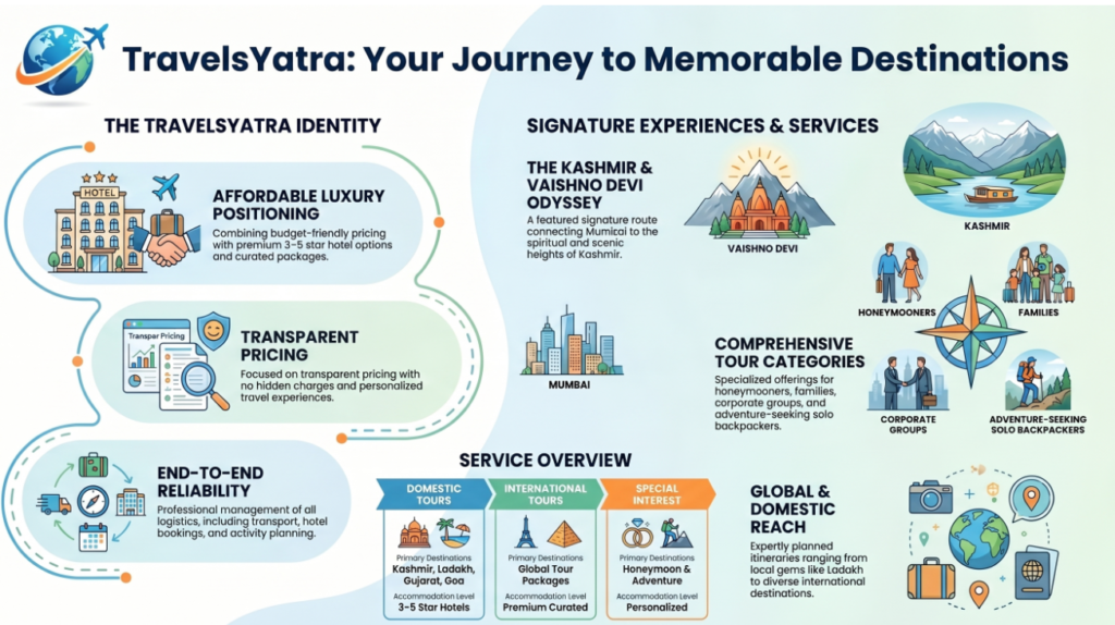The Vaishno Devi and Kashmir tour package from Mumbai promises two of life’s rarest gifts: spiritual transformation and breathtaking natural beauty — delivered together in a single, seamless journey. The planning complexity is real, but that is exactly what we are here for. From Mumbai airport transfers to Katra check-in, from yatra registration to Srinagar houseboat, every detail is handled so you can focus entirely on the experience.